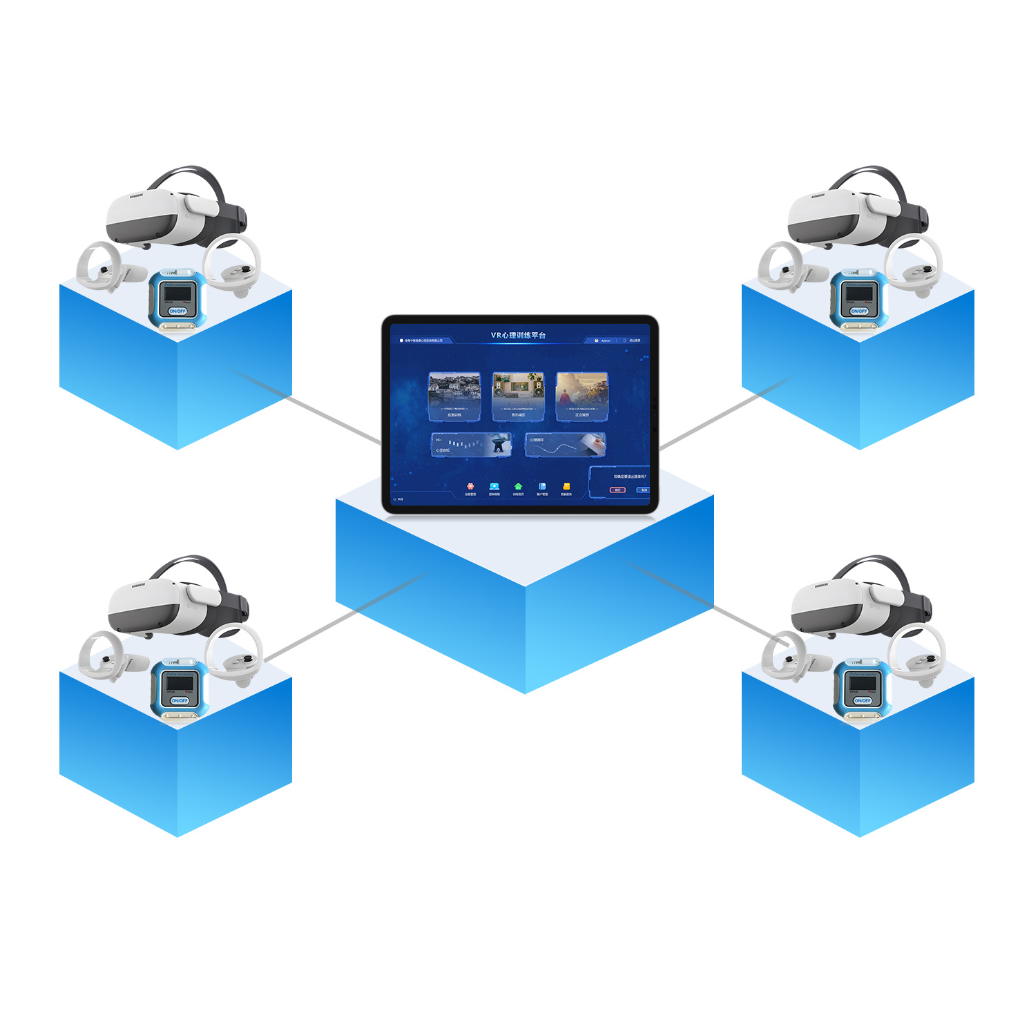 在硬件配置方面,该系统包含 4 台 PICO VR 头盔,分辨率为 3840X2160,PPI 达 818,真 4K 分辨率 RGB 排列,支持佩戴眼镜,无需手动调节,为用户提供清晰逼真的视觉体验。配备 4 个蓝牙手柄,采用两节 AAA 电池,约有 40 小时使用时间,具备一体机无线功能。同时,还有 4 个无线多参数生理指标采集仪,可采集散点图、HRT 直方图、脉搏容积波等不少于 20 项生理指标。另外,系统还配有 1 台平板电脑,内置管理端 VR 心理减压训练系统,用于对整个团体训练进行管理和控制。