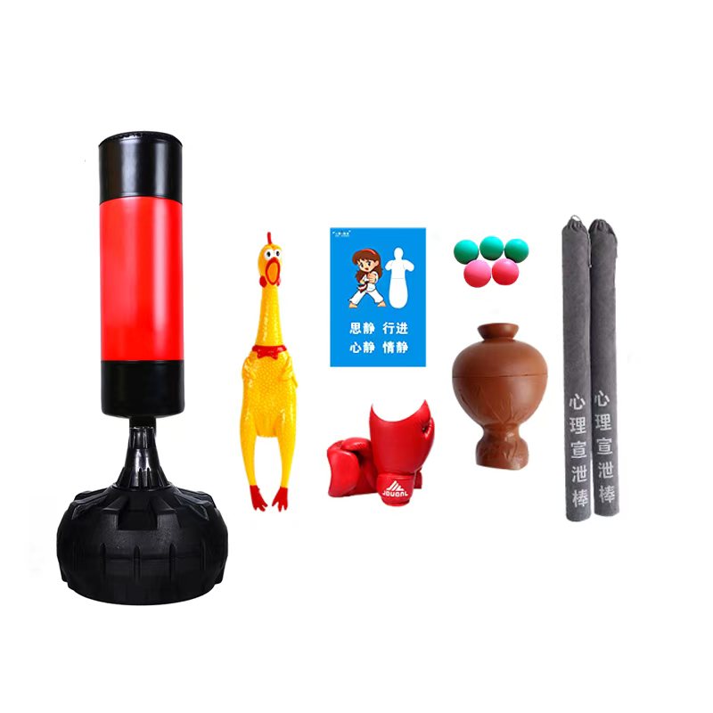 该套装包含多种宣泄工具。其中,宣泄柱是核心产品之一,它采用 PU 材质,高度为 175cm,圆形底座设计,可注沙或注水,稳定性强。其表面材质柔软且有弹性,击打手感舒适,能有效缓冲打击时的冲击力,让用户在宣泄过程中不会感到手部不适,同时也能减少噪音,避免对周围环境造成干扰。