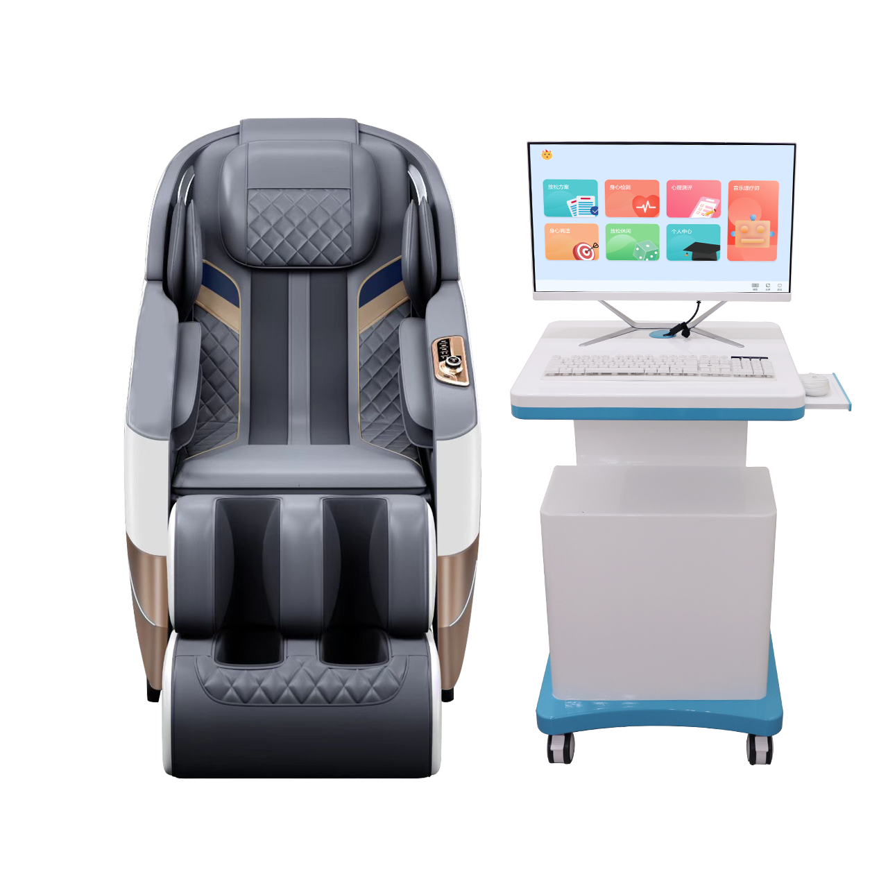 自带蓝牙系统,可与 IOS、安卓系统的手机、平板无线链接,播放心理音乐。平板系统或电脑系统内置 4 大类型高清心理视频,如催眠放松训练、肌肉放松训练等,还包含专业心理催眠图片、α 脑波音乐、冥想音乐等多种音乐资源,可调节人的情绪,缓解压力。配备智能手控器,可一键启动,操作方便。此外,还带有一键旋钮控制力度,扶手左侧有快捷控制面板,可进行开关机、加热开启、手法设置等操作,产品还带有 USB 充电口,方便用户使用。