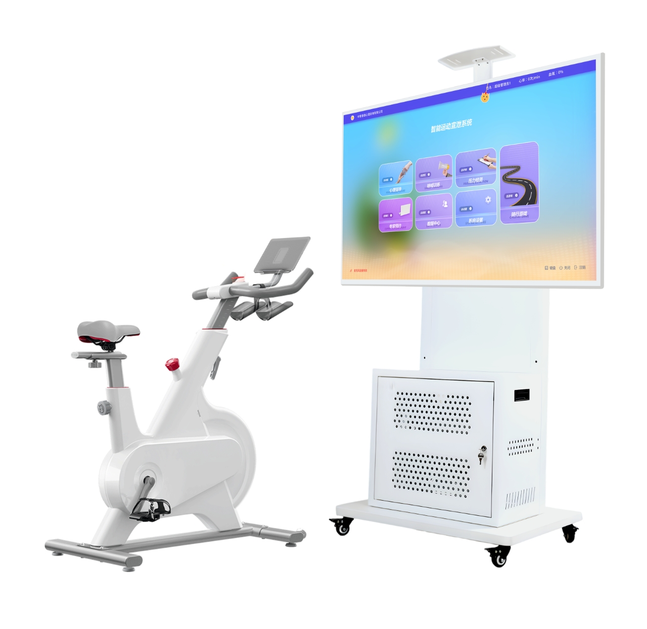 该系统的核心设备是一辆智能运动单车,单车最大负荷≤120kg,高度可调节,能满足不同身高用户的需求。它拥有 8 个阻力档位,用户可根据自身情况自主调节,车后配有 2 个辅助轮,方便移动,脚踏还配备脚套,确保使用安全。单车自带心率采集功能,用户只需手握在手柄上即可轻松采集心率,无需佩戴额外的采集器。